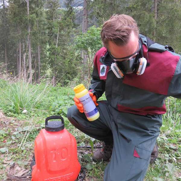 WICHTIG: Beim Hantieren mit unverdünnten und verdünnten Pflanzenschutzmitteln sind entsprechende Schutzhandschuhe, sowie ein Pflanzenschutzmittelanzug bzw. Schutzkleidung zu tragen.